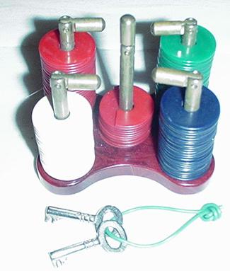 Typical American set in "trumpet case", comes with 5 burgundy bakelite racks, has 2 sets of 5 flowers, extra's for "jokers" and a "moneybank" |