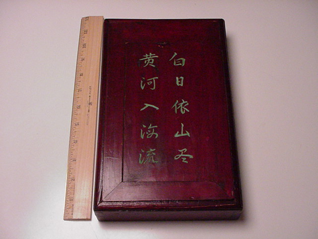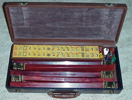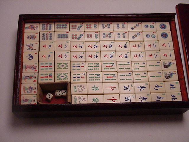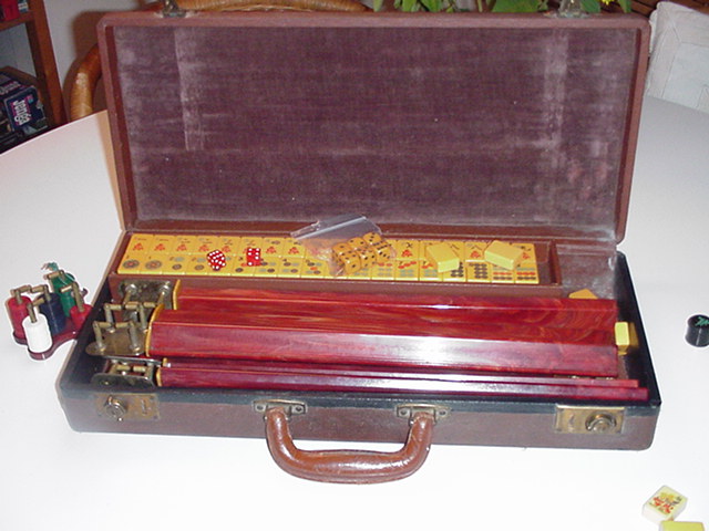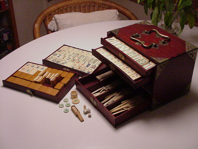 Typical (Chinese) export set from the 1920's, with western numerals, bone counting sticks, dice and ming. Rosewood chest with 5 drawers and slide-in front. I made the two larger bone dice myself :-) PLEASE HELP! I need a slide-in front for this set! pega@xs4all.nl - Thanks!!! |
