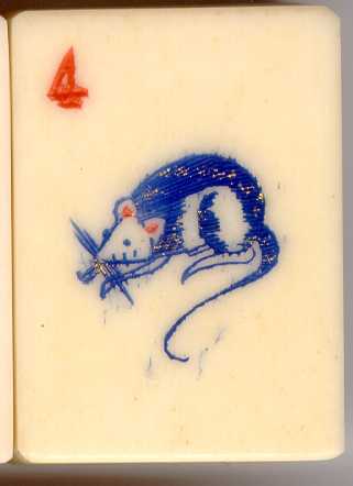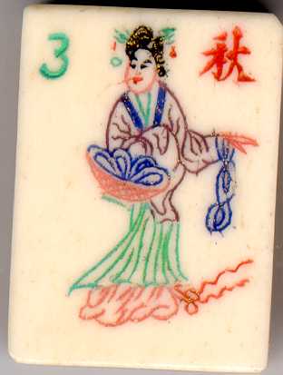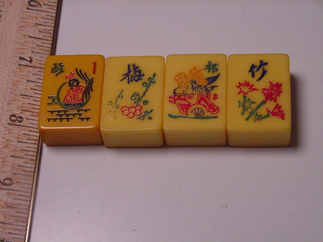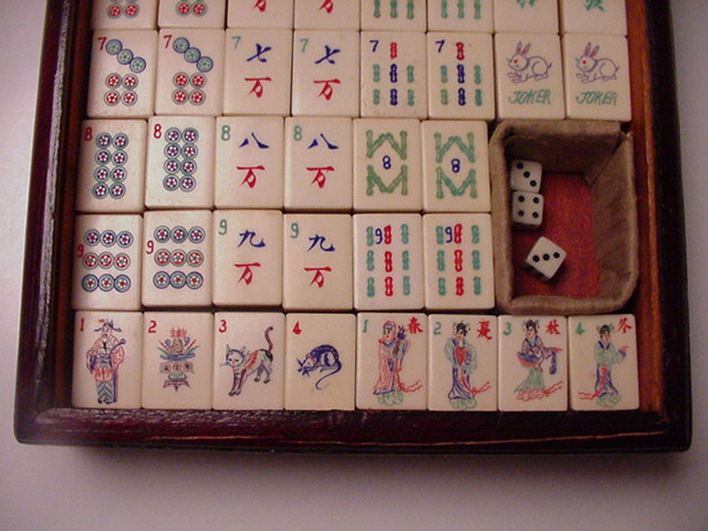 Even smaller bone/bamboo set with nice quality carving. Inscription on box is first two lines from a traditional poem: "The sun us setting behind the mountains, the Yellow River flows down to the sea, if you wish to see further, then you must rise higher". Features: gold on some honours (see close-ups). Seasons include a set of 4 ladies. Includes 4 rabbits as "jokers". All dots are intricately carved and "flowered" from 1 thru 9 instead of simple circles within circles... |