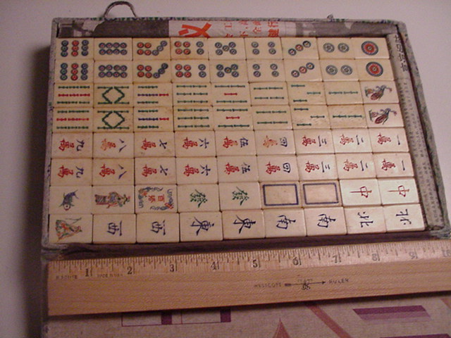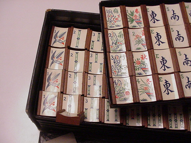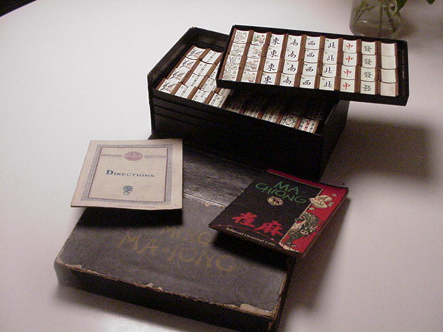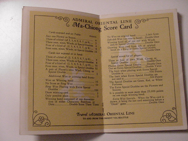 "Ming Ma-Jong" set: Cardboard chest of drawers, The booklet, from Admiral Oriental Line (steamship line) 1923, is not original to the set, but came with it. The celluloid faces slide into the tiles, which have runners. Being concave, the faces of the tiles don't wear from use. However, the set looks unused. |