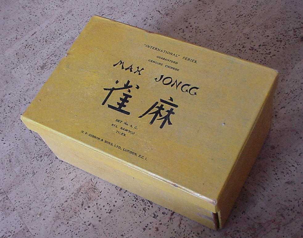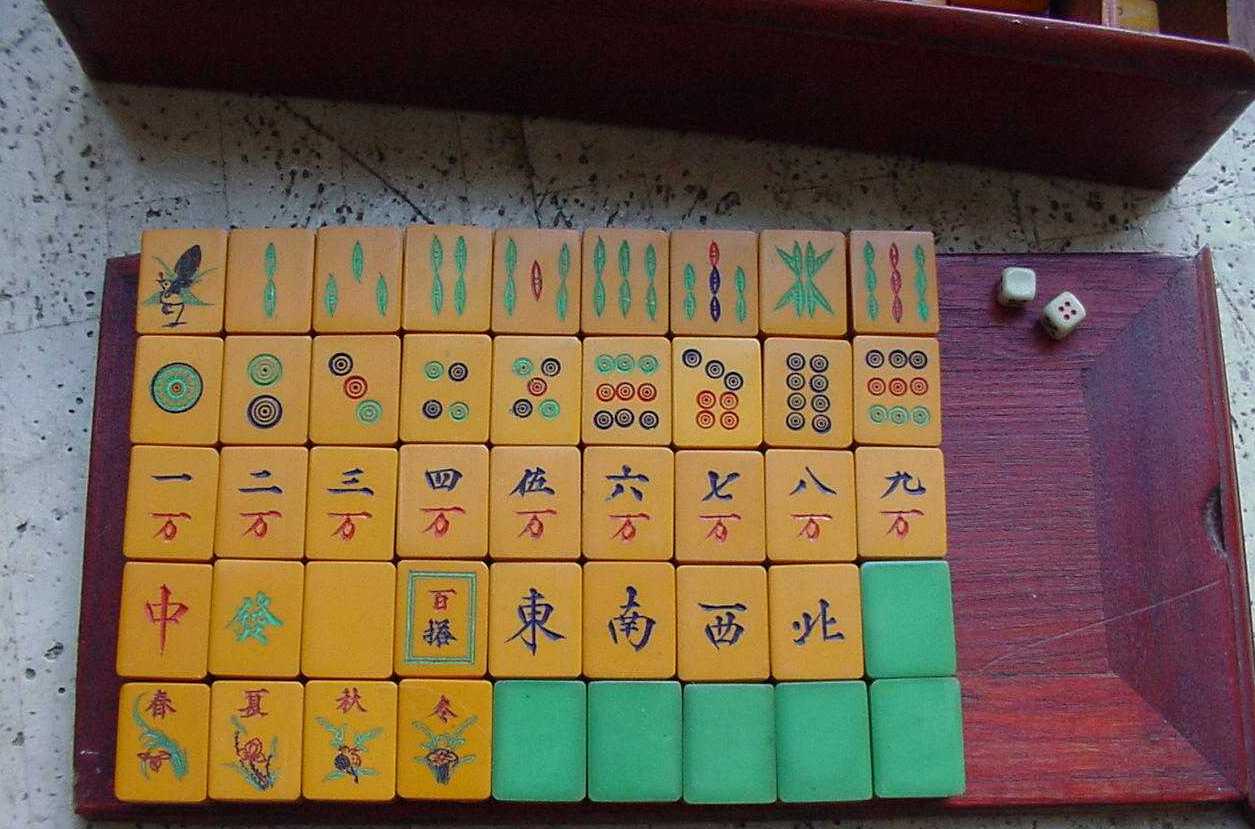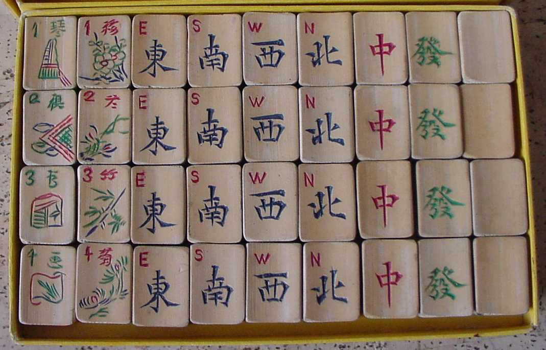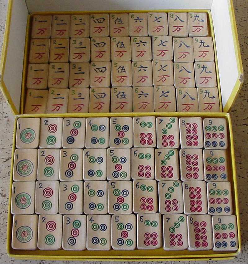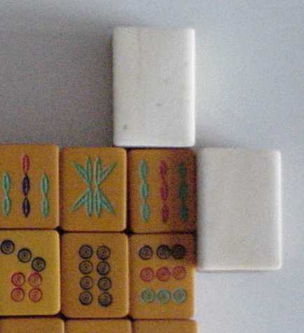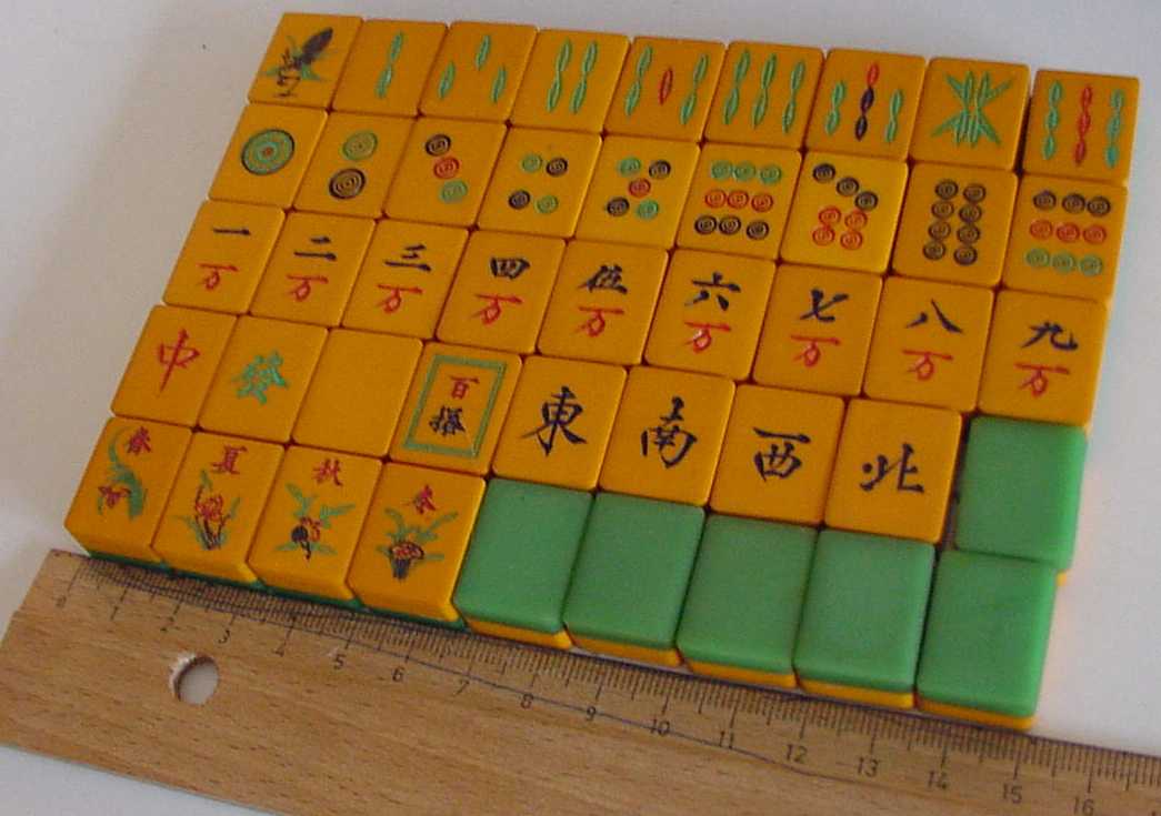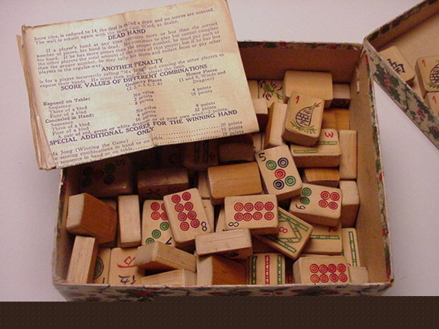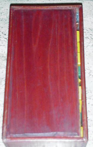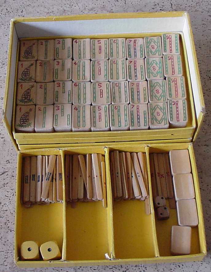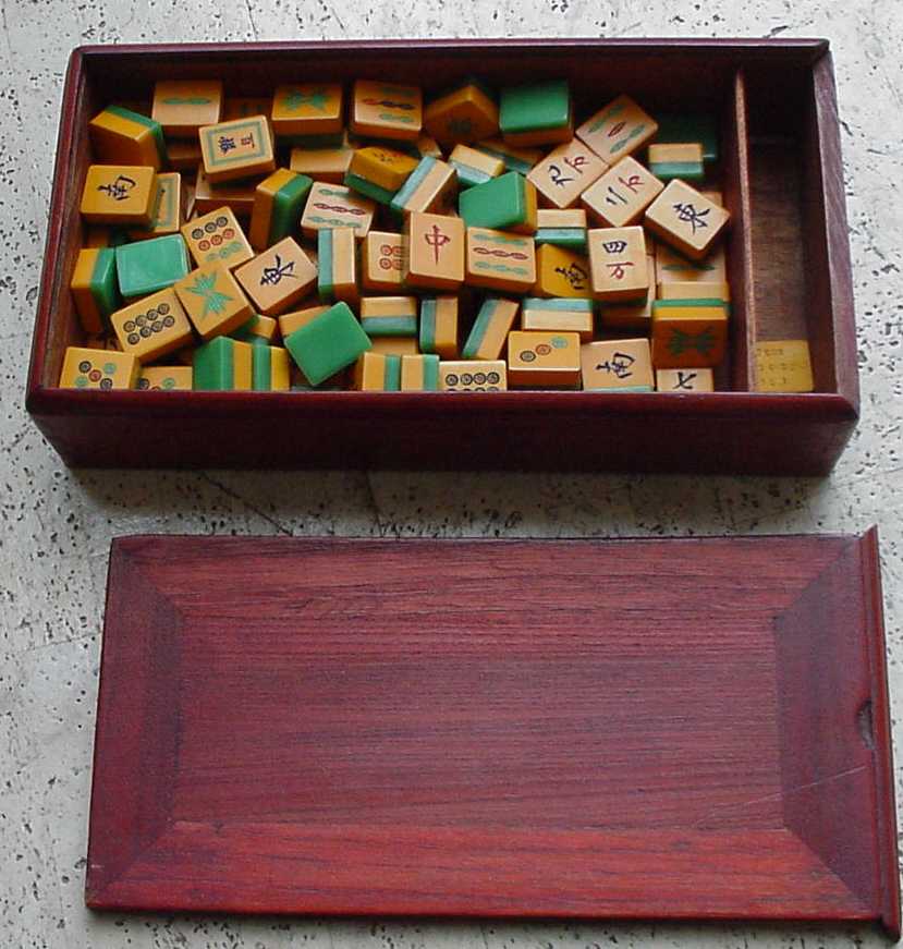 An unusually small set of 2-tone bakelite tiles in a slide-top box. The tiles are hand-carved as opposed to pressed and the bamboos are of a not uncomman but untypical design. Includes 4 oriental-style jokers. The #1 bam is in a style which I refer to as 'art-deco' ;-). The box shows some shrinkage on the bottom which probably attests to considerable age. The set has no arabic (or western) numerals, suggesting it was not made for export to the west. |