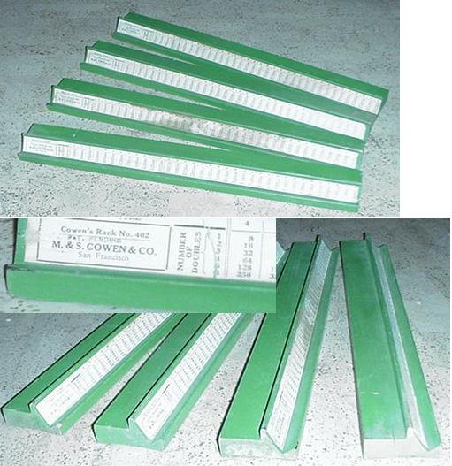 Wooden tile racks with doubling-table - style "nr. 402". These racks have a nice broad surface for 'declared' tiles and a concave base for easy sliding (while building the wall) on e.g. a cloth surface. |