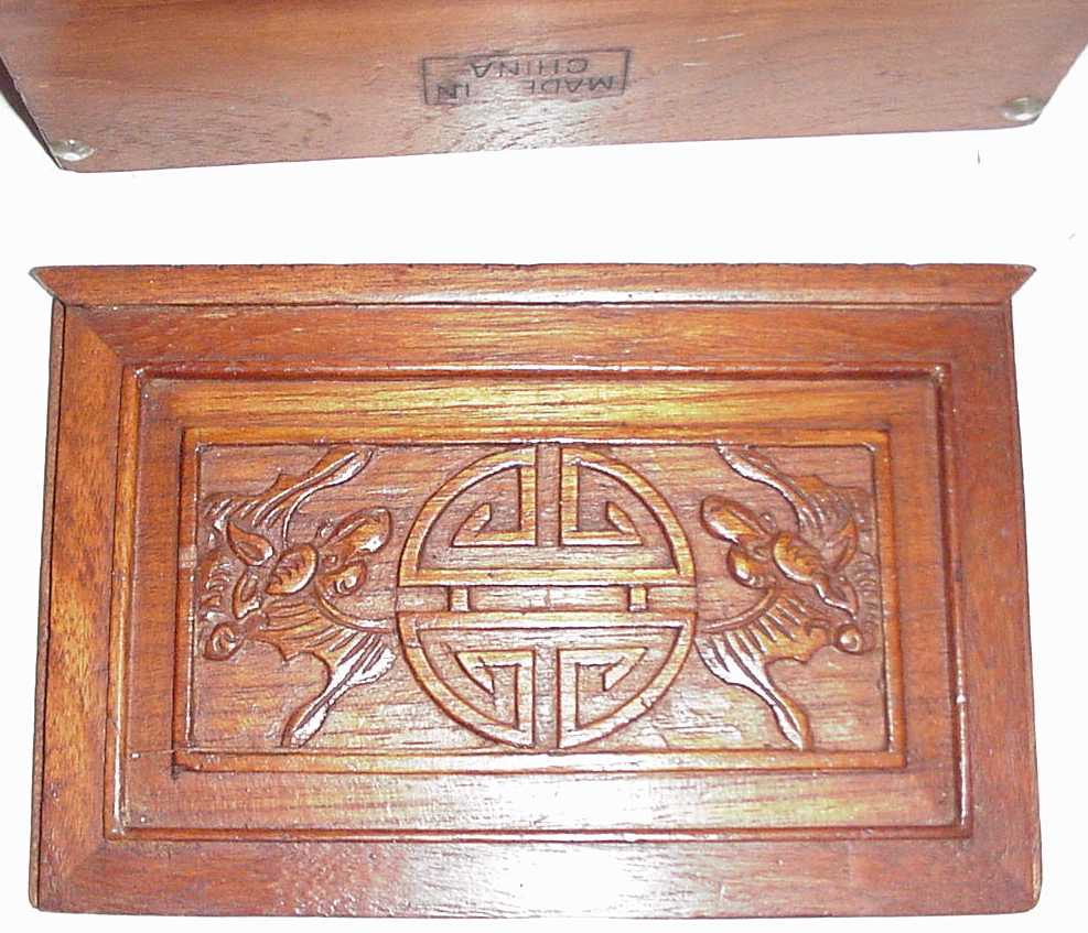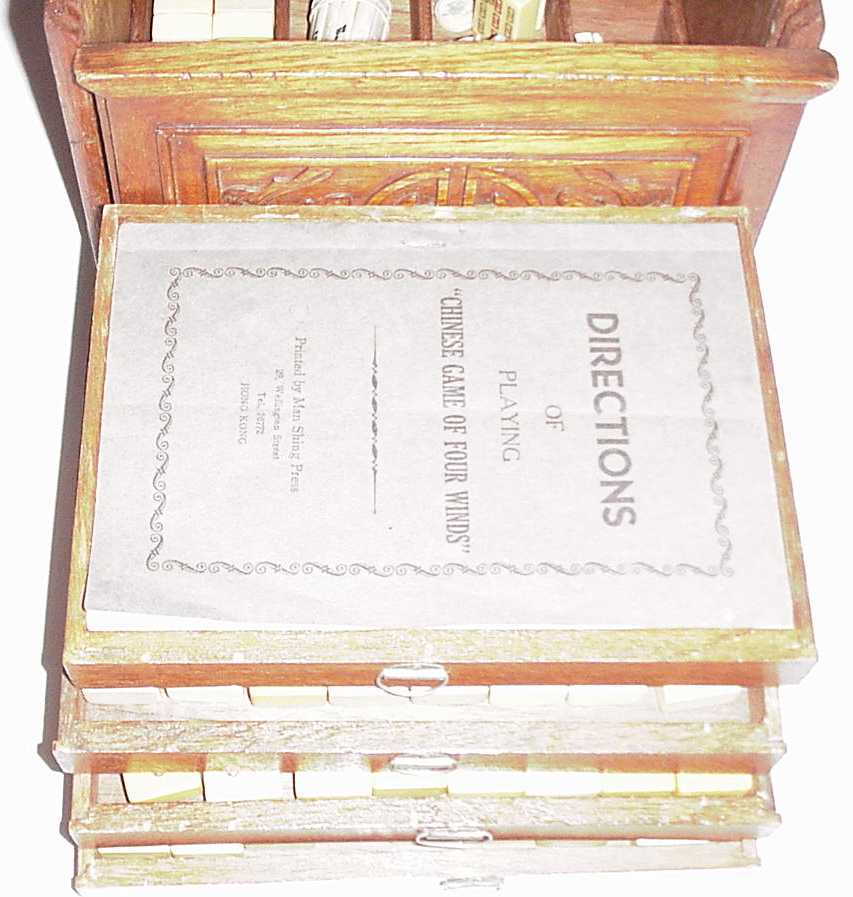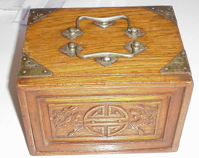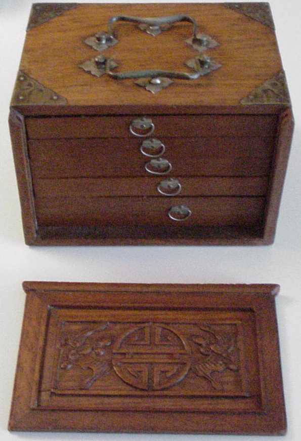This box is oak. Unlike most 5-drawered chests, this one is slightly smaller than usual. The front is nicely carved in relief and shows "stylized" bats, a symbol of good luck in most of the Orient. The chest has no shelves for the drawers which fit snugly, simply stacked on top of each other. The rule-book is probably original as it fits precisely in a drawer. |