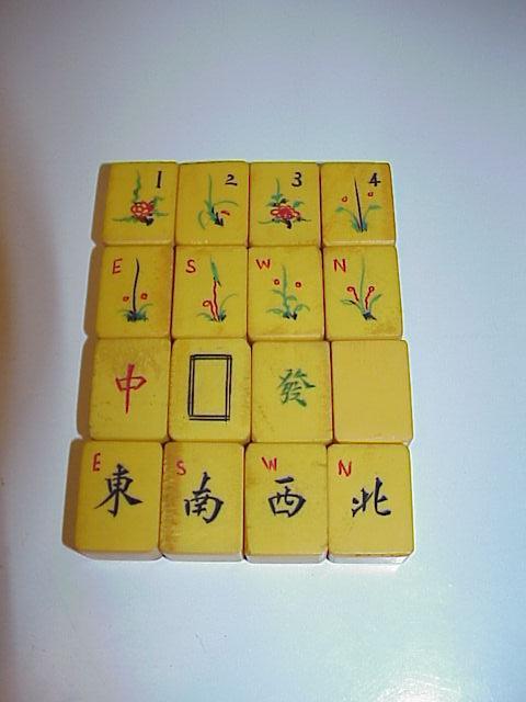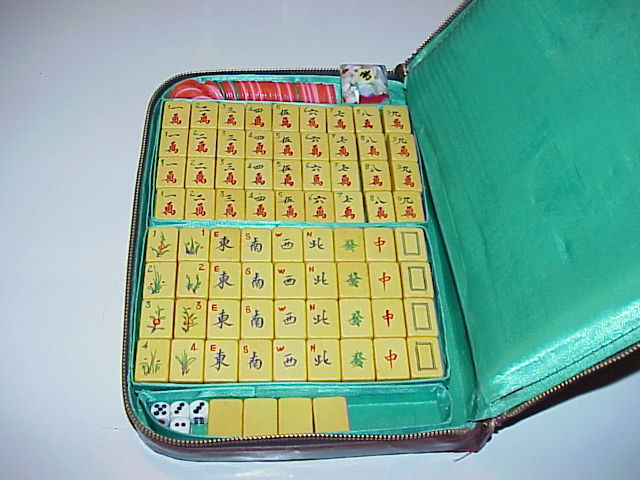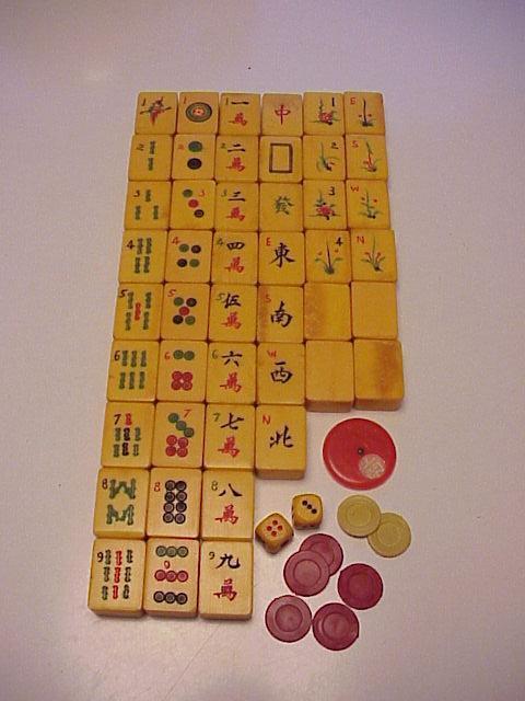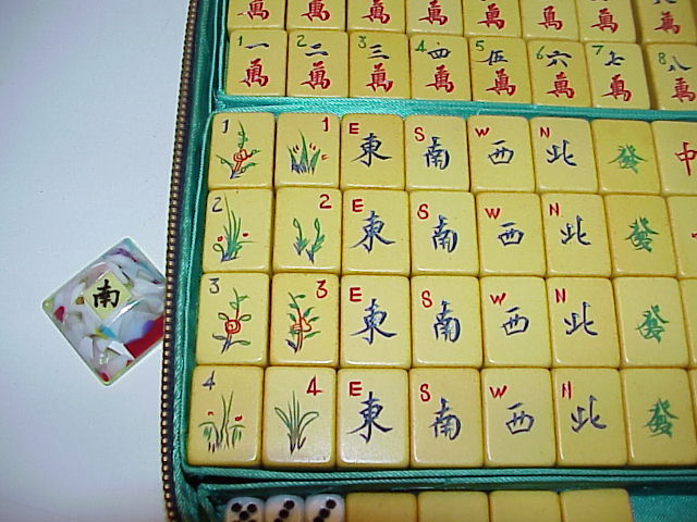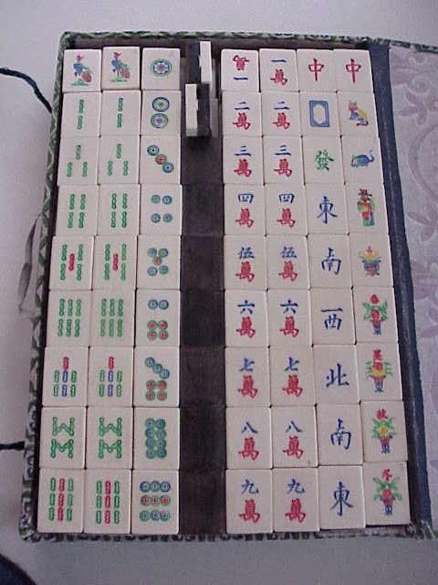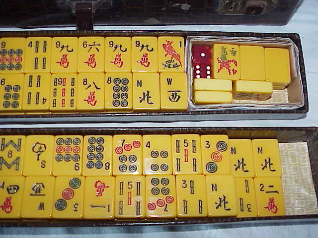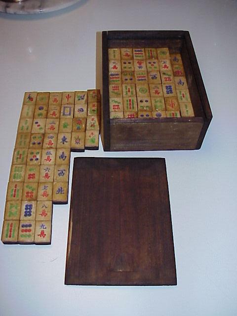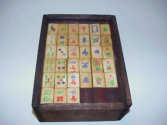 Modern set of Chinese tiles in slide-top box from the province of Yuangshuo. Both the bone and the bamboo of the tiles have been stained to give the appearance of antiquity. I have two of these sets and will readily sell one of them - feel free to email for details or better pictures. |