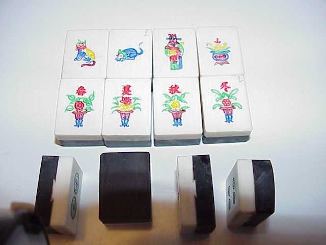 Set of bone tiles with black bone backs from China. HAs no western numerals. Most probably made from "fish-bone" (pulverised fish bones reconstituted). Lack of "Haversian System" attests to this. |
