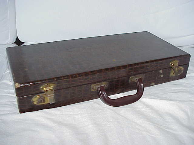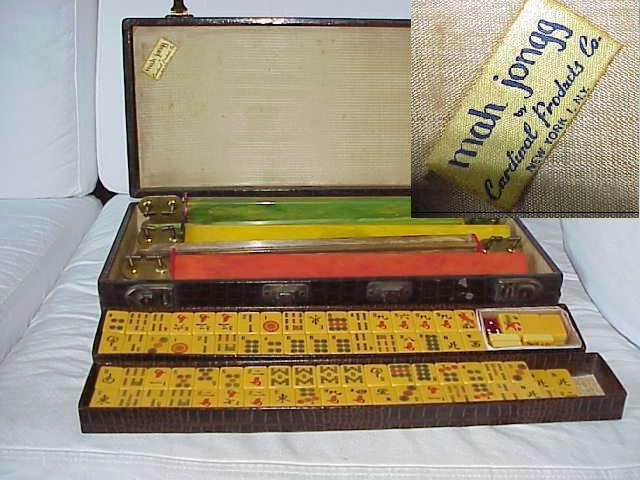 Another typical American set in trumpet case. Tiles are catalin in a faux alligator case. Comes with 5 multi-coloured racks. |